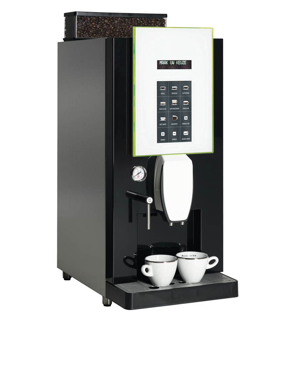 De glazen voorzijde met decoratieve LED-verlichting en geïntegreerde manometer (drukmeter) geeft de machine een luxe uitstraling. Via het capacitieve touchscreen kies je eenvoudig uit maar liefst 24 verschillende warme dranken.